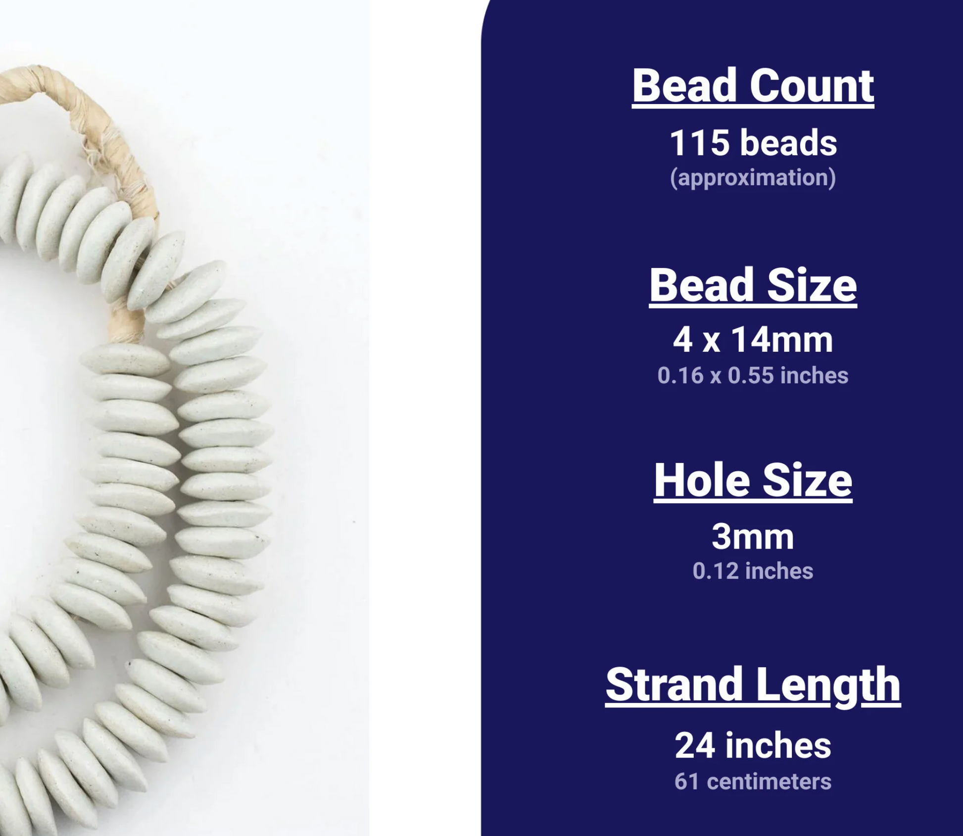 Checkout this beautiful strand of white color Ashanti glass saucer beads. The process of making these beads is unique to Africa and has been used for over 1000 years. Pulverized glass of various colors is poured into a clay mold, using a cassava stem for the bead's hole. The mold is placed in a furnace and heated until the glass particles congeal without actually melting and the stem burns out. The Ghanaians have been making beads in this manner since the 1600s. Each bead measures approximately 13-14mm in diameter.