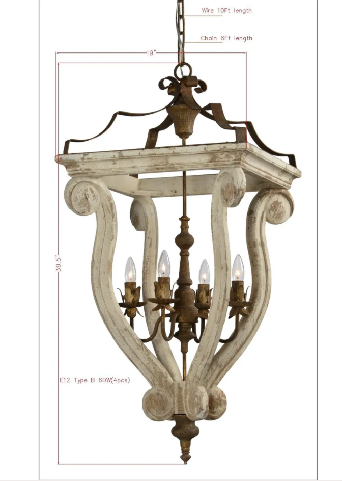 Abbey 4-Light Chandelier - The Abbey 4-light chandelier is an updated spin on the traditional lantern-style chandelier. It features a distressed cottage white open lantern accented in beautiful, rusted metal pieces with a hint of golden bronze tint. Abbey uses four (4) 60-watt candelabra base bulbs (not included). This chandelier is 19.5 inches wide, 19.5 inches deep, and 37 inches high. Abbey comes with 6 feet of chain for hanging, 10 feet of wire, ceiling canopy, and hanging hardware. W19XH39.5 CHAIN: 6' WIRE: 10'