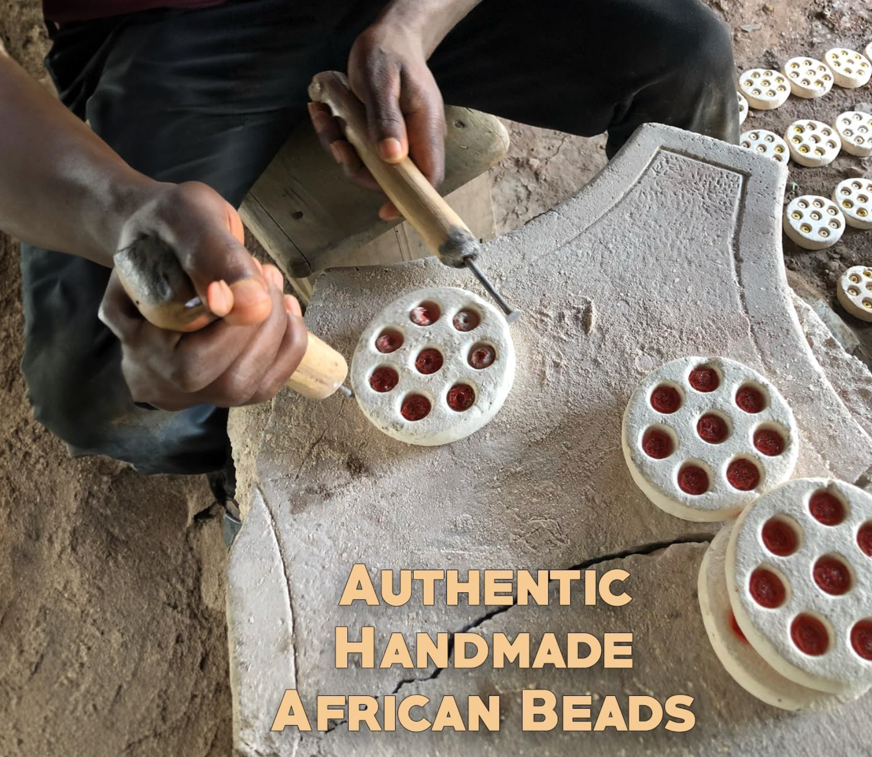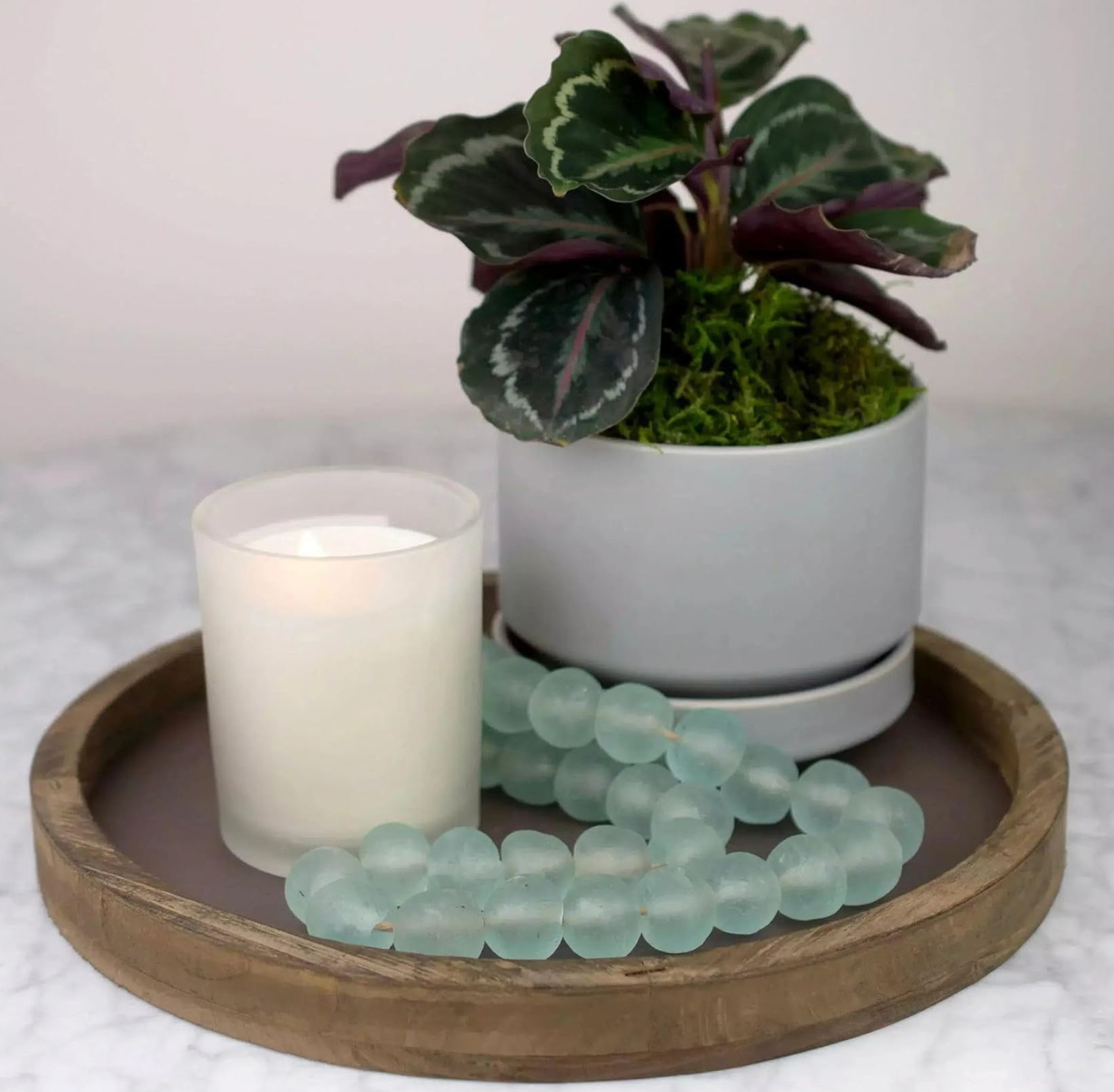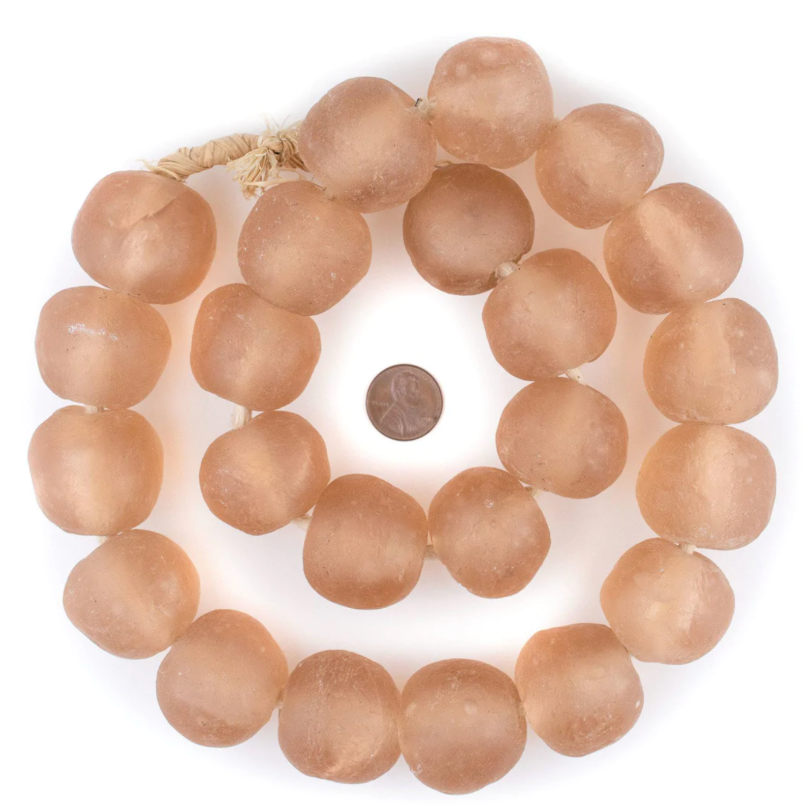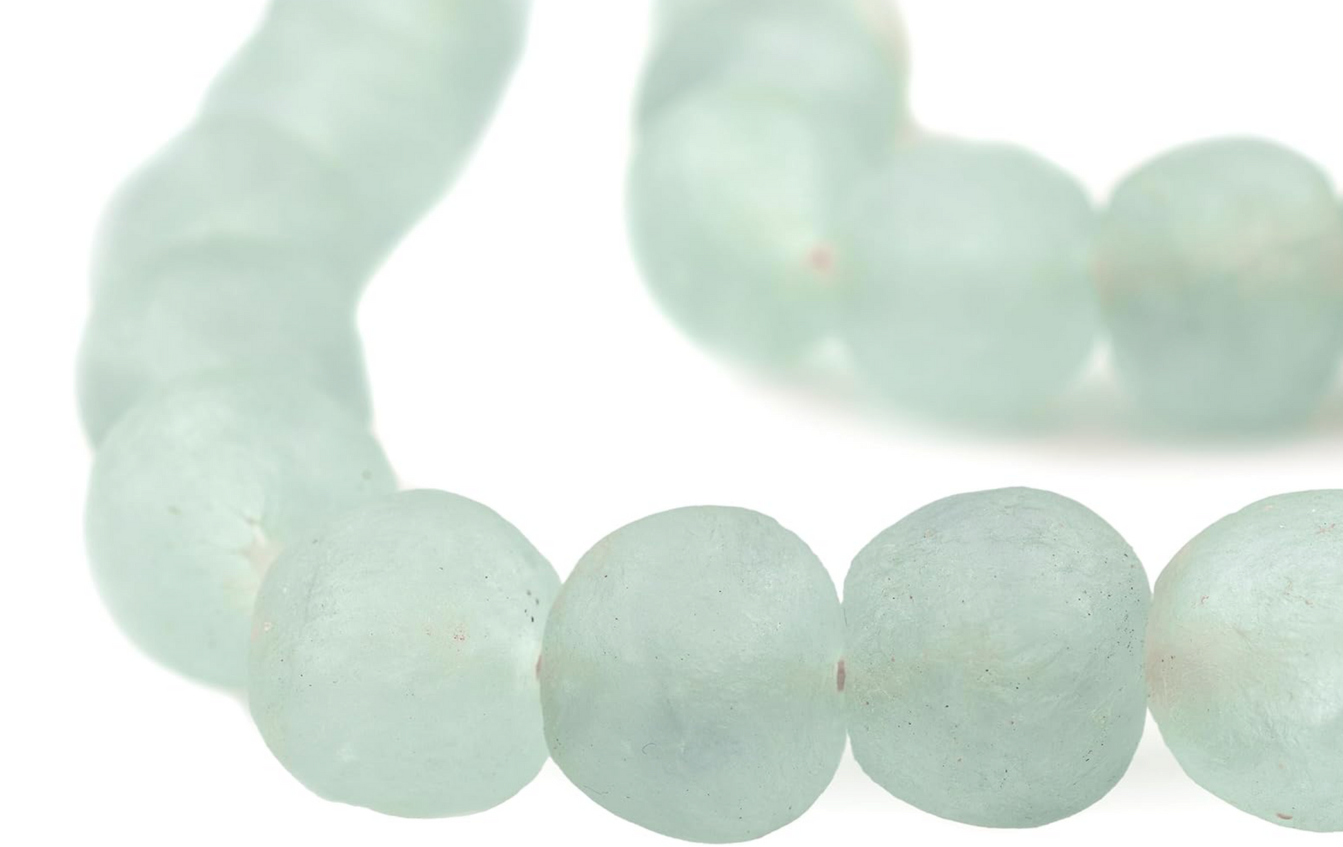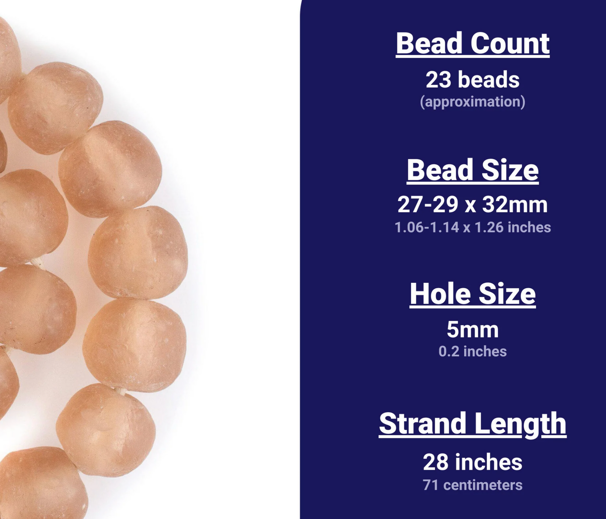 Take a look at this exceptionally large strand of jumbo-sized recycled glass beads. Large beads such as these are hard to find and even harder to find in good condition. The journey from Africa can sometimes be unkind to such large beads! These beads are sure to make an impression wherever they go. Use them as centerpieces for special jewelry, as adornments for interior design, or even as a wall hanging to decorate your favorite room. You will receive a 28" strand with approximately 23 beads. Recycled glass beads are a type of indigenously produced African bead from Ghana West Africa. These special beads are made using an old method that has been used for centuries. The glass itself is derived from a variety of recycled sources including old beverage and medicine bottles. The procedure for making the beads consists of a number of steps whereby powdered glass is poured into molds of clay and baked in a specialized oven. These beads are produced in large part by the Krobo tribe and are environmentally friendly. Some beads may have chips or internal fractures due to long journey. Teal & Clear are 23mm beads and the Pink are 32mm beads.