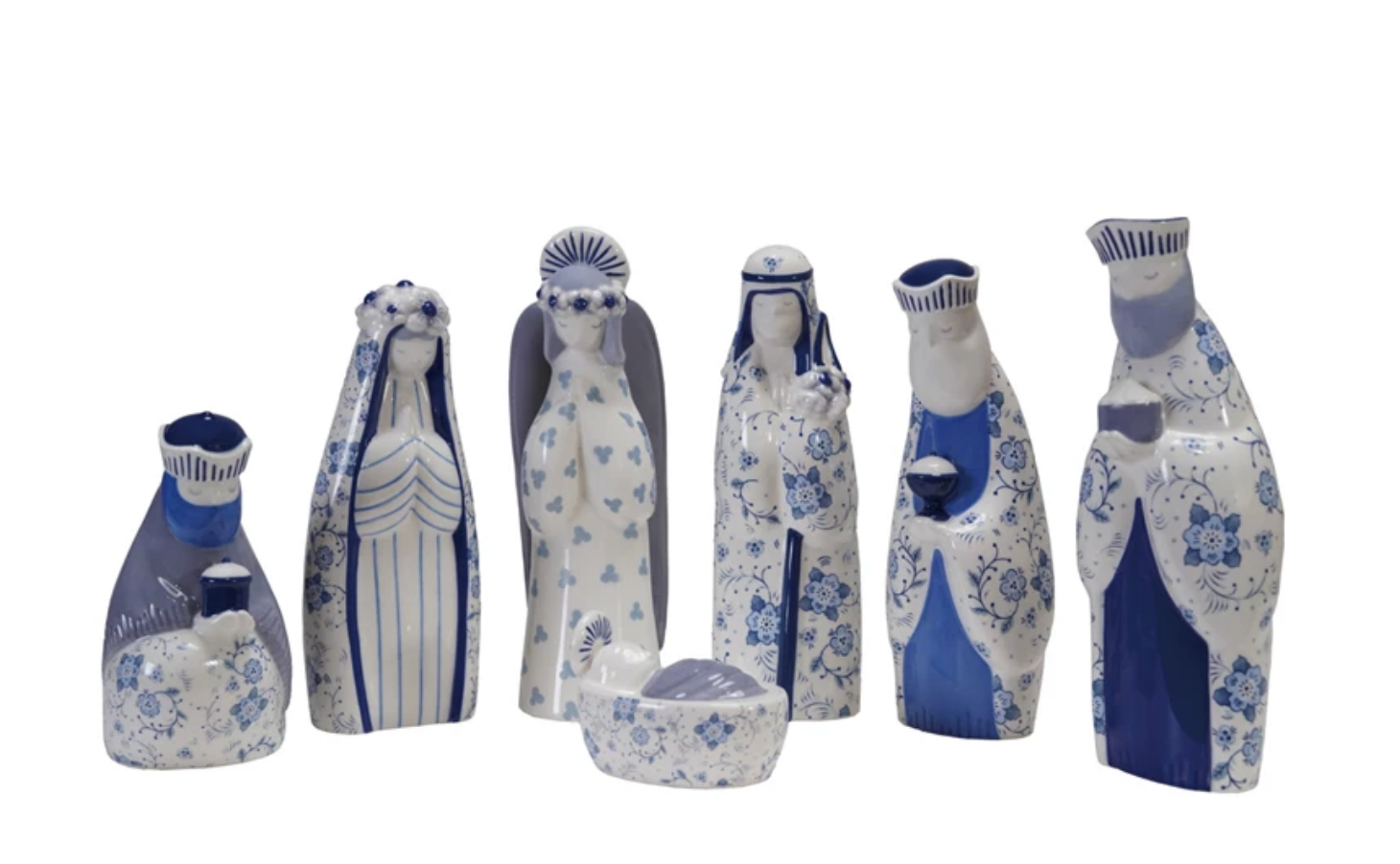 Ceramic Nativity with Floral Pattern, Blue & White, Set of 7
