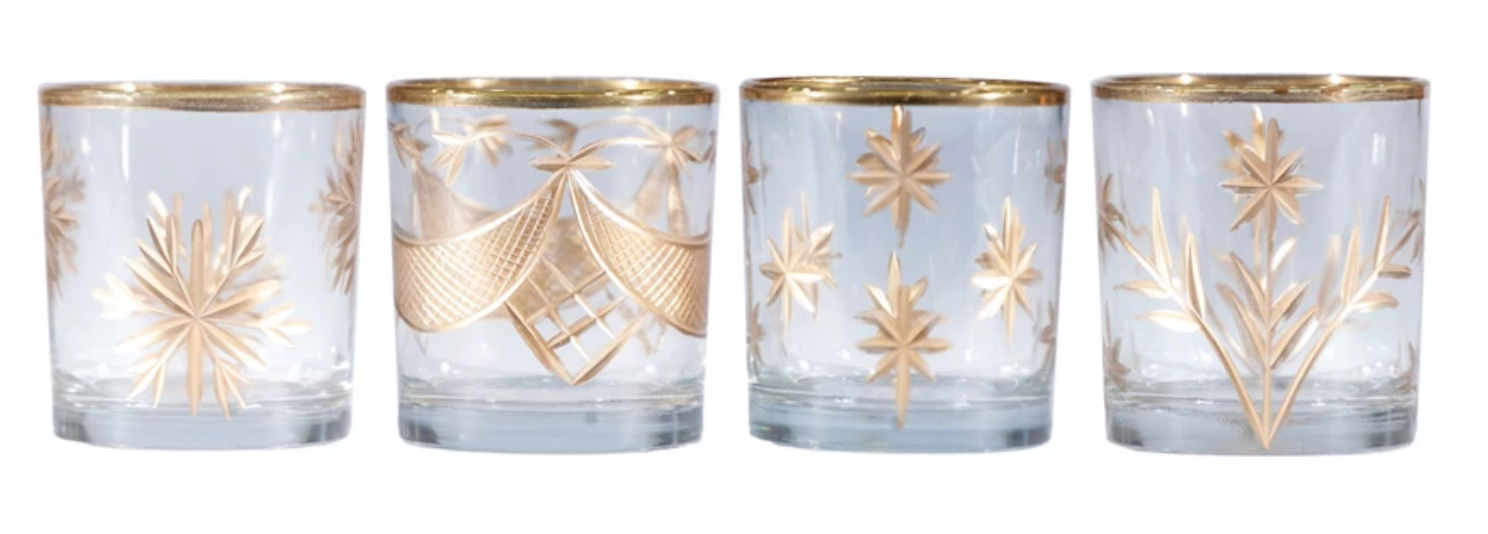 Add a luminous touch of artistry to seasonal decor with this four-piece set of hand-painted etched glass tealight/votive holders, each featuring delicate gold-finished designs. Crafted to enhance Christmas and winter settings, these exquisite pieces create a soft, inviting glow, perfect for illuminating dining tables, mantels, or decorative sideboards. Made from glass with intricate etching and a rich gold finish, they combine craftsmanship with holiday elegance. Measuring 2.75 inches in diameter and 3 inches in height, they offer a graceful yet impactful presence in festive arrangements.