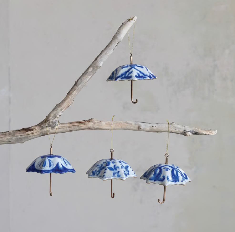 This hand-painted stoneware umbrella ornament features a classic blue and white pattern and is finished with a metal handle. Its detailed craftsmanship and durable design make it a charming and lasting addition to your home decor, offering a touch of elegance and comfort in every space.