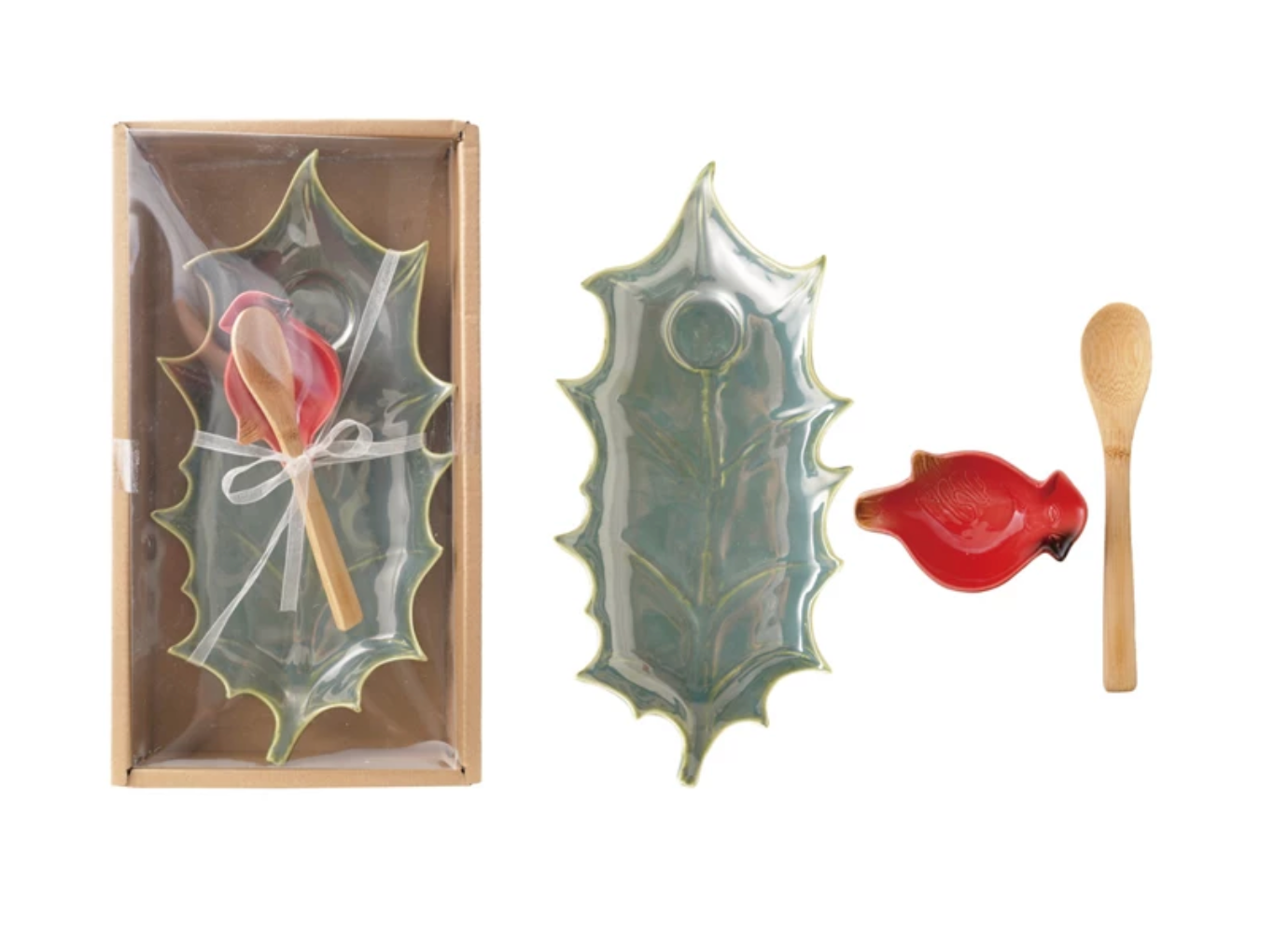 - Stoneware Holly Leaf Shaped Plate w/ 3-1/2"L x 2-1/4"W Cardinal Shaped Dish & Bamboo Spoon