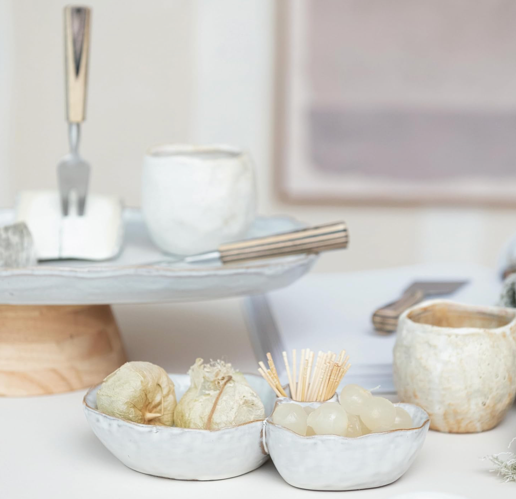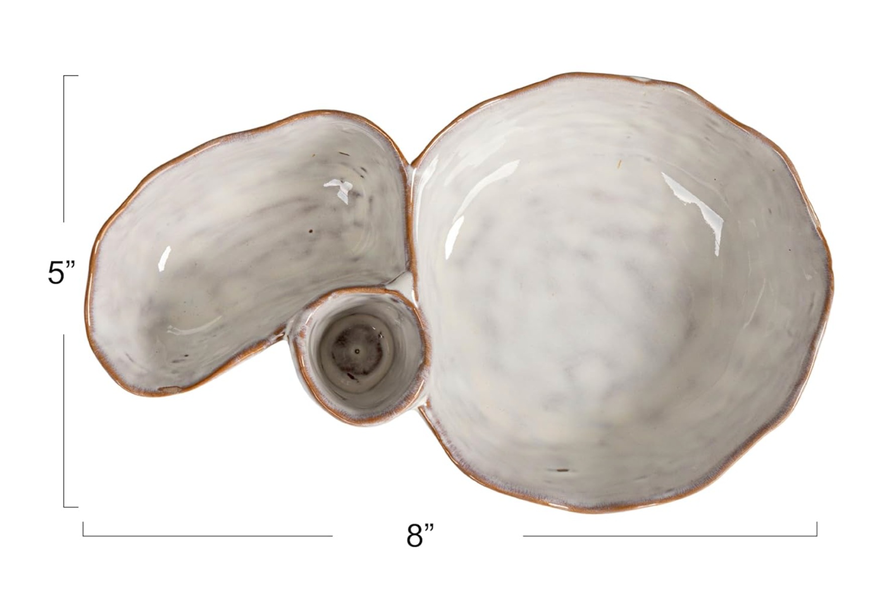 - A sophisticated stoneware dish with three compartments, finished in a reactive white glaze for a sleek, modern look