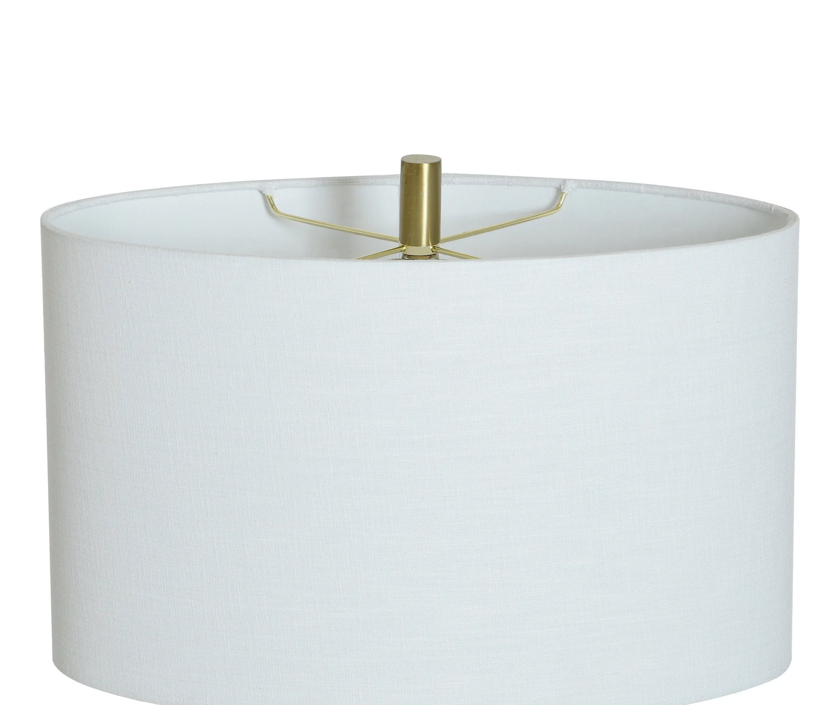 Capture tasteful design in your interior space by placing this elegant ring table lamp in your home. This piece is beautifully crafted from cement and steel and finished in a speckled cream with brass accents. This piece is topped with an oval ivory shade, creating a timeless lighting fixture that is a stunning addition to your home.